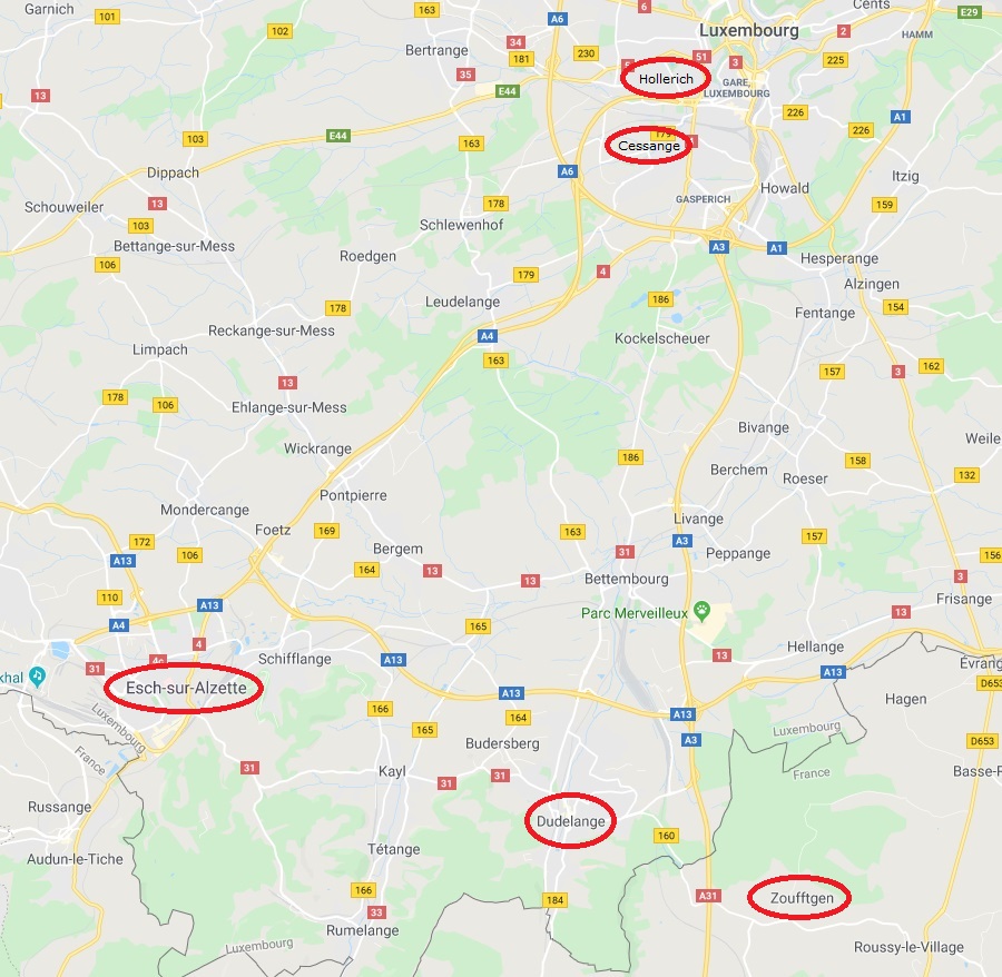 The last known location of the Reuter/Metzler family prior to immigration was in Moutfort, commune of Contern, district of Luxembourg, in Luxembourg. The Reuter family had lived in Moutfort and Gondelange, canton of Remich in the district of Grevenmacher. The Metzler family lived on the west side of Luxembourg City, in Cessange and Hollerich. Earlier Metzler generations lived south/southwest of Luxembourg City in Esch-sur-Alzette and Dudelange, Luxembourg, and in Zouftgen, France.