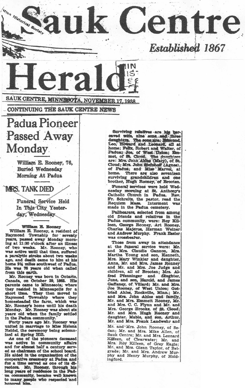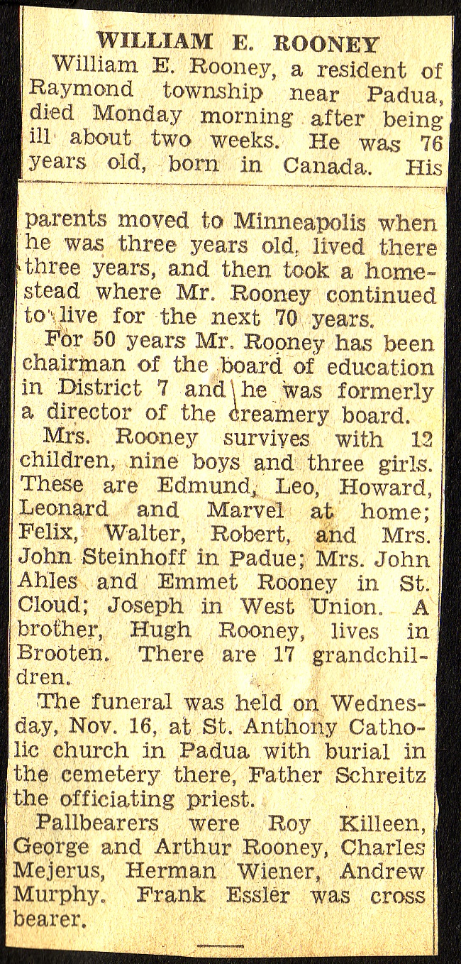 Death: November 14, 1938, Raymond Township, Stearns County, Minnesota